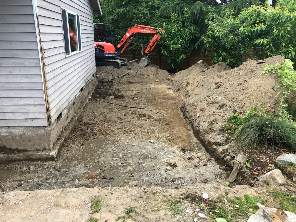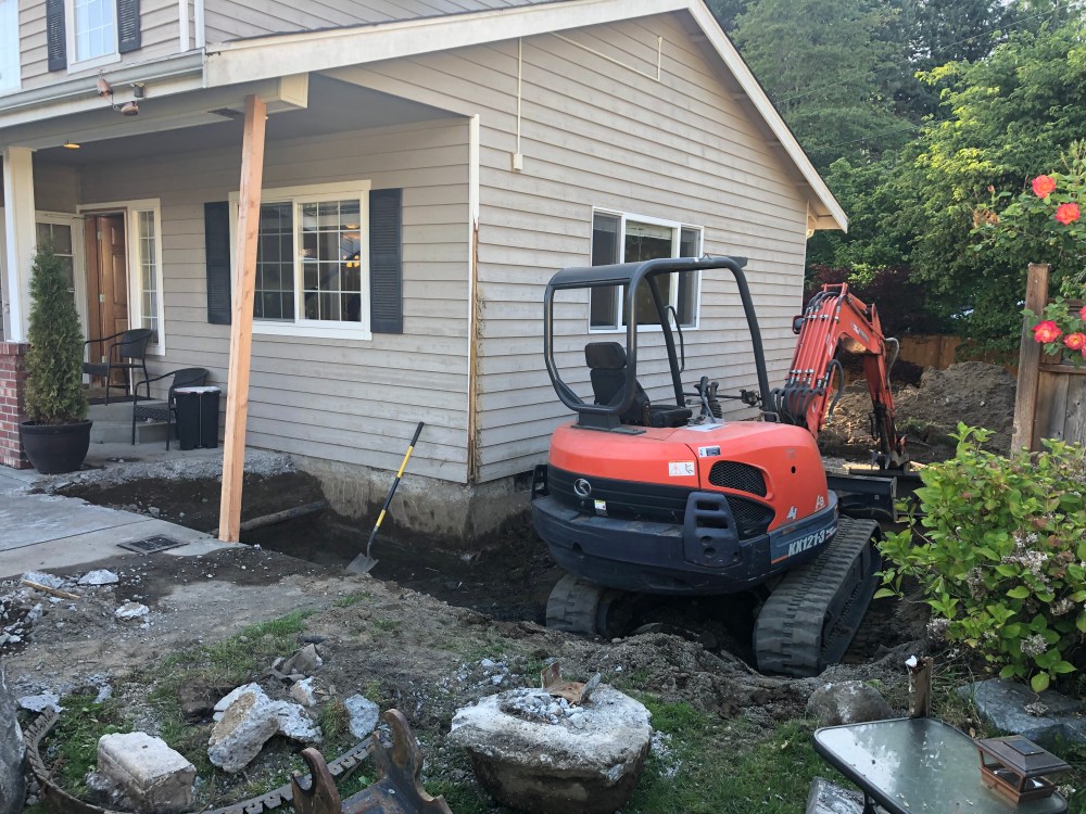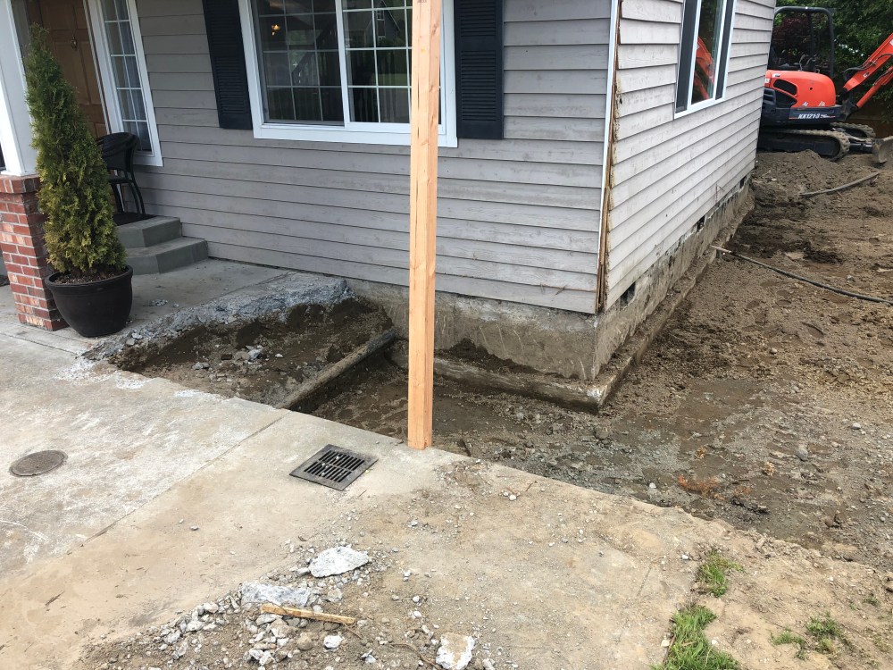 We now have a large hole dug on the side of our house and part of our front patio is gone. The backhoe has been hard at work today and is prepping the area for our foundation to be laid.