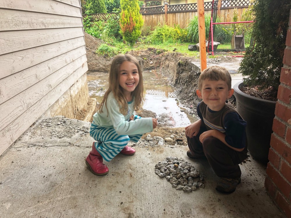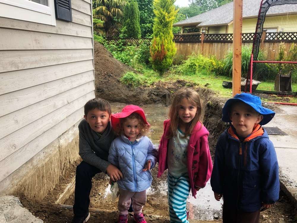 Nathan, Leah, Rebecca, and Ben standing in the newly dug area for the foundation.