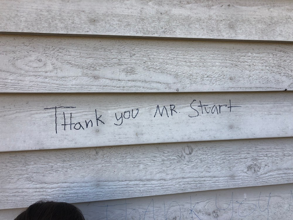 Big flat areas are fun for all sorts of things and big walls that are going to be torn down are fun for other things. After talking with the children of how we could bless our contractor, Mike Stuart, they decided to write thank-you notes on the exterior wall of the house. What fun! We get to draw and write our names all over the one side of the house. Wow, when did you ever get to draw on your parents house?