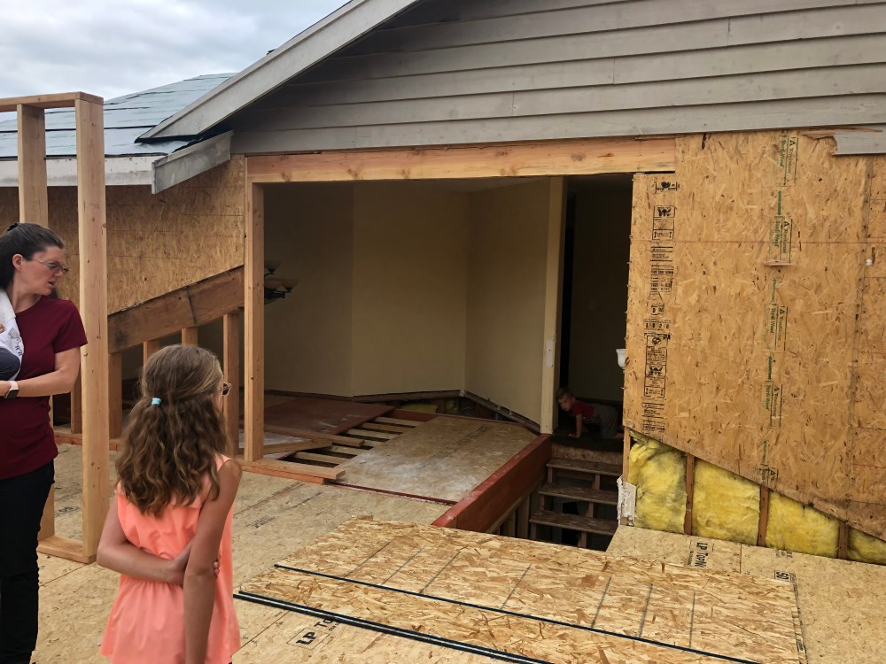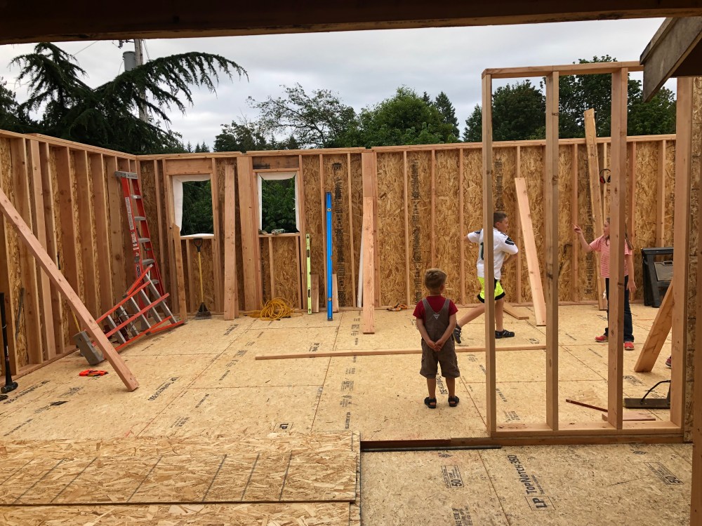 Things are moving along and we have plenty more walls, trusses, and boards to go up over the next few weeks. We are truly thankful for all friends that have provided the evening resting places for us. Living in our sunroom and garage has been quite an adventure. It has been like camping indoors.