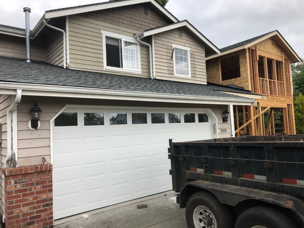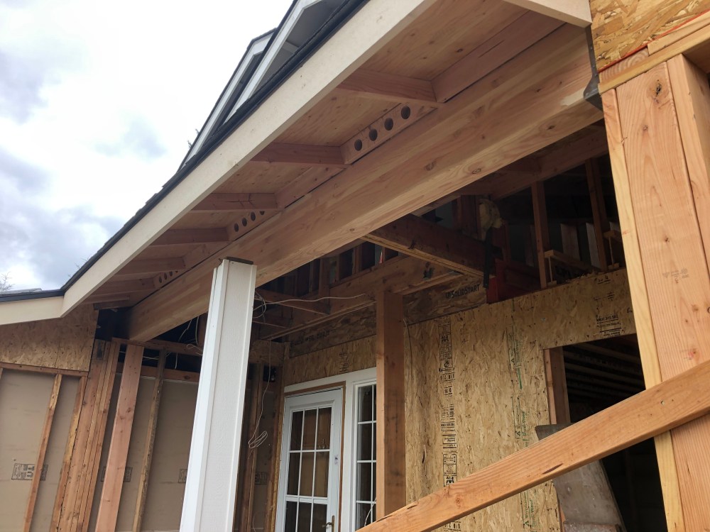 The new undersides beam above the entry way. We will have the ceiling there covered into stained cedar planking with three inset lights.