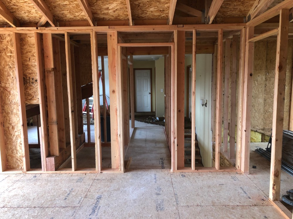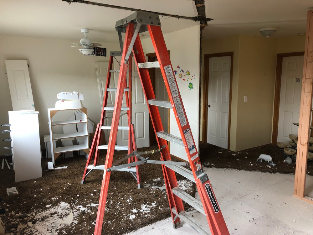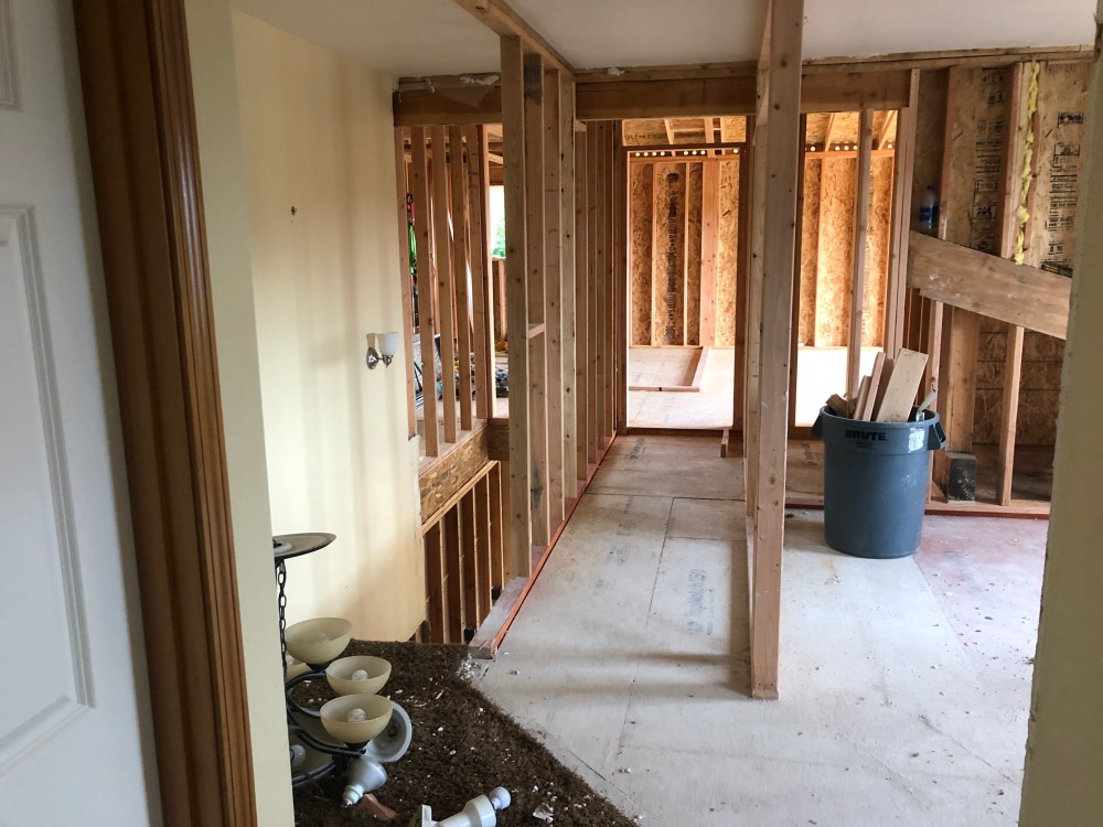 The wall of the boys room is gone, the entry way ceiling has been filled in which becomes the boys room new floor.